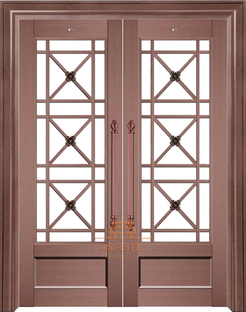 产品加工:1.钢质材料经过抗氧化处理后,剪板折弯,焊接成型,2.紫铜板经过氧化拉丝封釉,剪板折弯,依照钢        内胆大小做处各分件后,粘贴于内胆表面,手工工制作成分较多,故此铜门对手工要求是比较高的