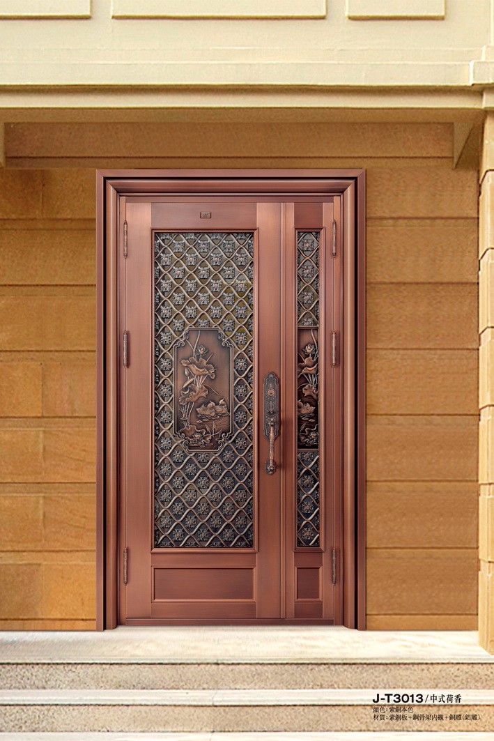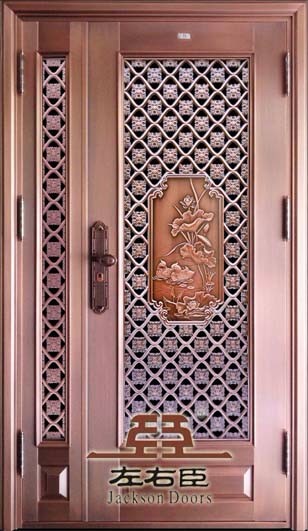 产品加工:1.钢质材料经过抗氧化处理后,剪板折弯,焊接成型,2.紫铜板经过氧化拉丝封釉,剪板折弯,依照钢        内胆大小做处各分件后,粘贴于内胆表面,手工工制作成分较多,故此铜门对手工要求是比较高的
