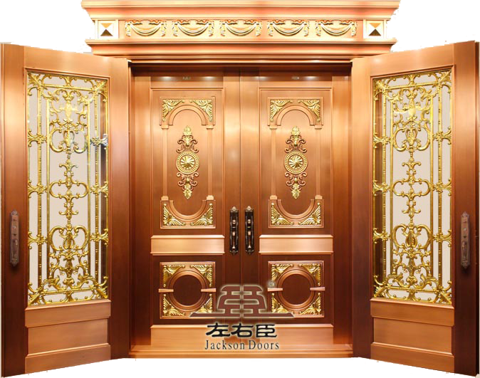 产品加工:1.钢质材料经过抗氧化处理后,剪板折弯,焊接成型,2.紫铜板经过氧化拉丝封釉,剪板折弯,依照钢 内胆大小做处各分件后,粘贴于内胆表面,手工工制作成分较多,故此铜门对手工要求是比较高的