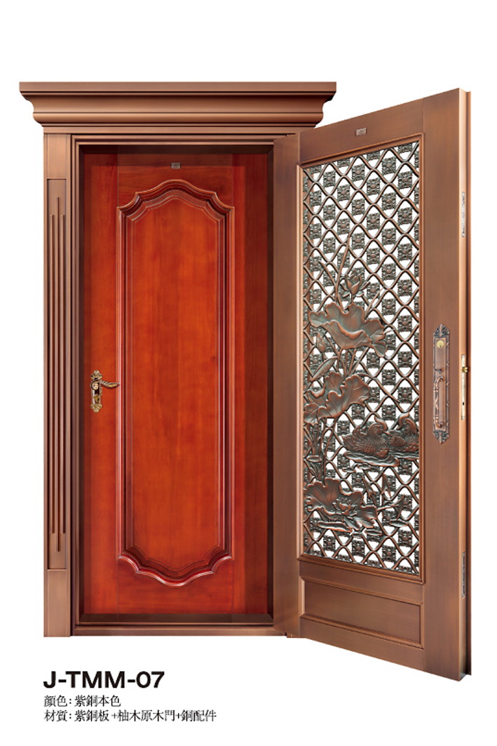 产品加工:1.钢质材料经过抗氧化处理后,剪板折弯,焊接成型,2.紫铜板经过氧化拉丝封釉,剪板折弯,依照钢 内胆大小做处各分件后,粘贴于内胆表面,手工工制作成分较多,故此铜门对手工要求是比较高的