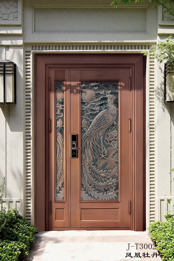 产品加工:1.钢质材料经过抗氧化处理后,剪板折弯,焊接成型,2.紫铜板经过氧化拉丝封釉,剪板折弯,依照钢 内胆大小做处各分件后,粘贴于内胆表面,手工工制作成分较多,故此铜门对手工要求是比较高的