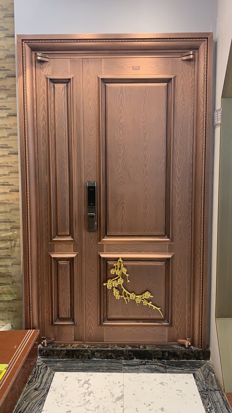左右臣铜门重量重,里面有内衬,一个门做两层,表层是铜皮,里层做镀锌板或者不锈钢内衬。